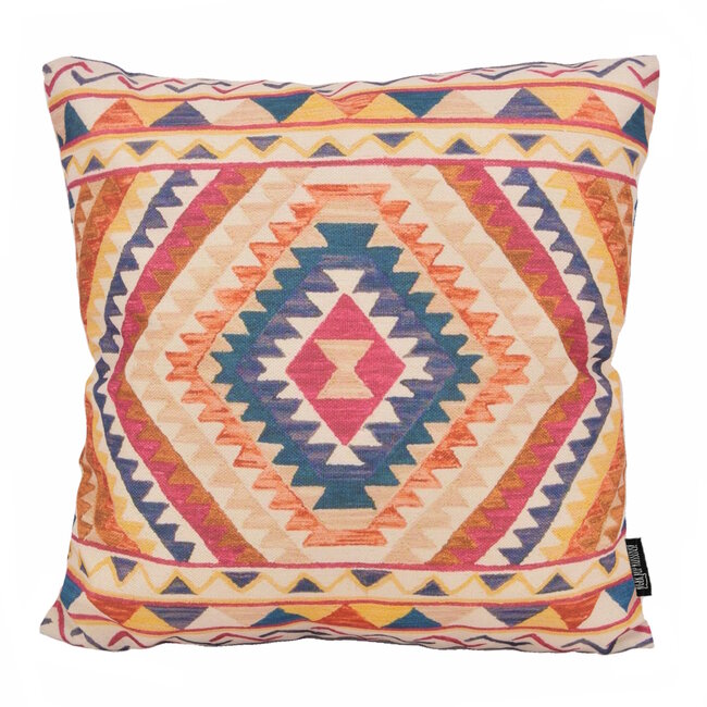 Het materiaal is een mix van katoen en linnen, een soort canvas. De hoes heeft een print aan beide kanten. Je kunt de hoes het beste op een milde manier op de hand wassen, zo blijft de hoes langer mooi en beter van vorm.
