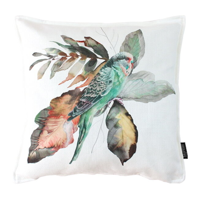 Een sierlijke papagaai, mooie kleuren, bladeren, stevige stof. Deze kussenhoes haalt de jungle in huis!