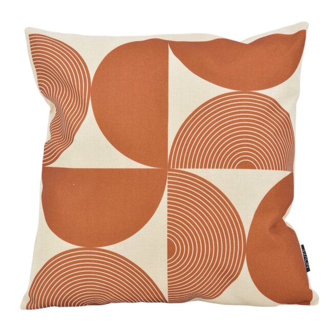 Een grafische print met zachte ronde vormen in warm bruin en crème. Het lijnenspel geeft dit ontwerp een tijdloze mid-century uitstraling met een moderne twist.