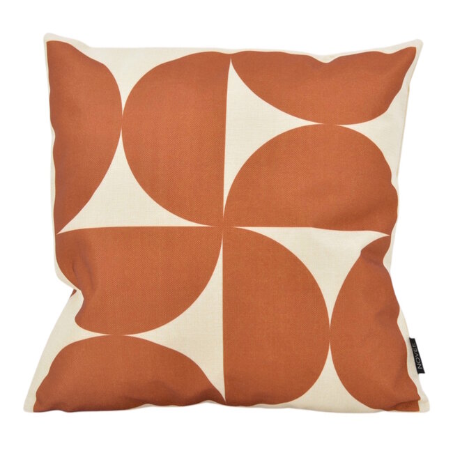 Een grafische print met zachte ronde vormen in warm bruin en crème. Het lijnenspel geeft dit ontwerp een tijdloze mid-century uitstraling met een moderne twist.