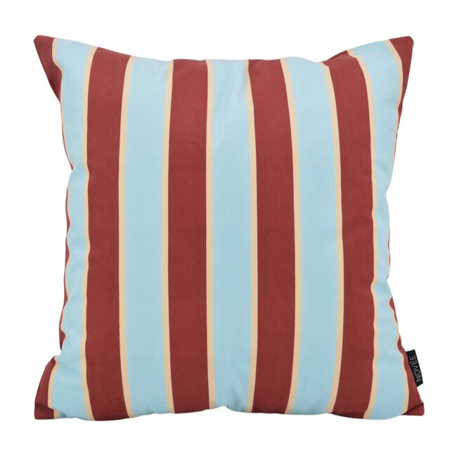 Een frisse combinatie van zacht blauw en diep donkerrood. De klassieke streep geeft dit kussen een tijdloze, elegante uitstraling met een subtiele mediterrane touch.